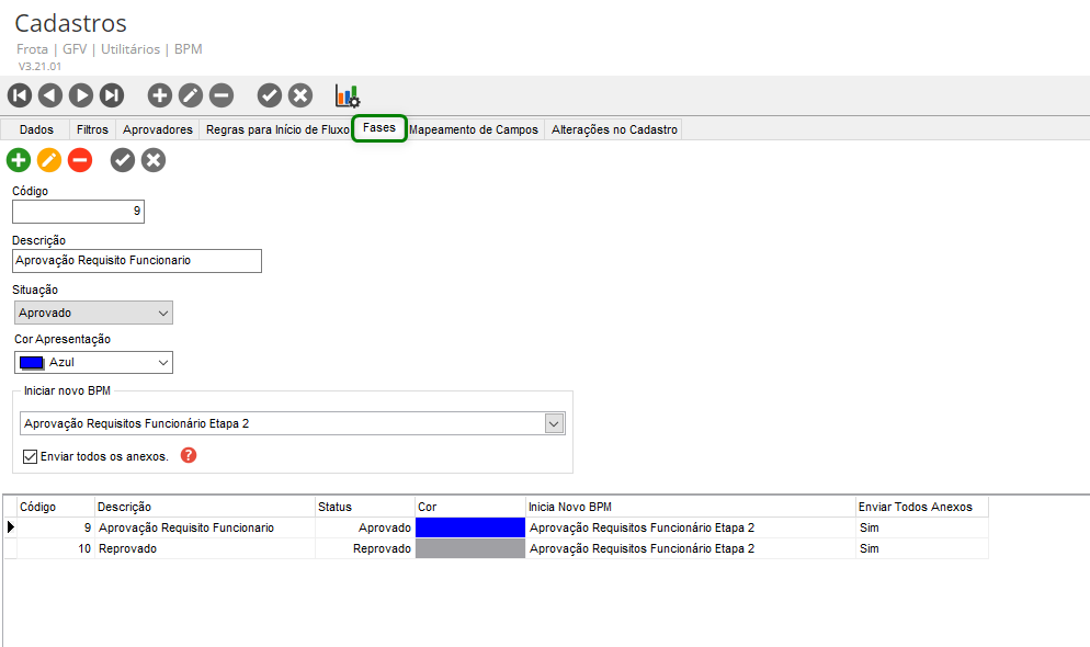 Na guia Fases, é possível configurar a apresentação visual de cada situação do BPM previamente definida no GFV, como: Em Execução, Aprovado, Reprovado ou Finalizado.