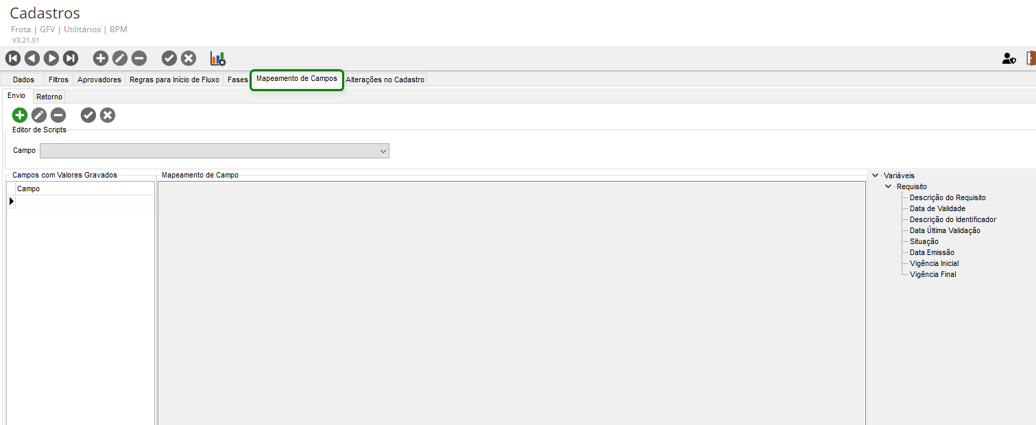 A guia de Mapeamento de Campos permite que o usuário cadastre dados que podem ser enviados à Plataforma Senior X ou atualizados no banco de dados do GFV.