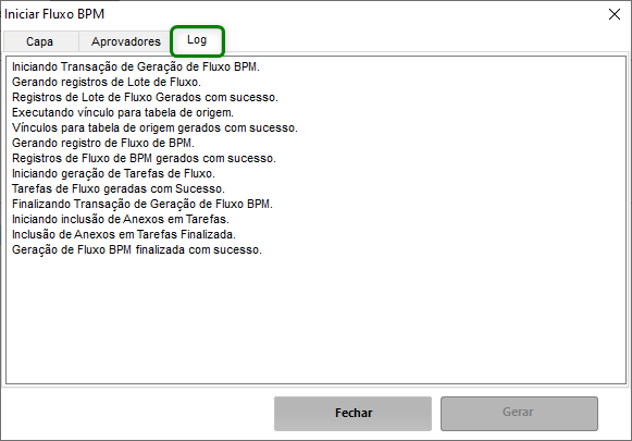 Após a geração do BPM, os logs da operação serão apresentados na guia Log. Caso a operação ocorra normalmente, os logs terão o seguinte formato: