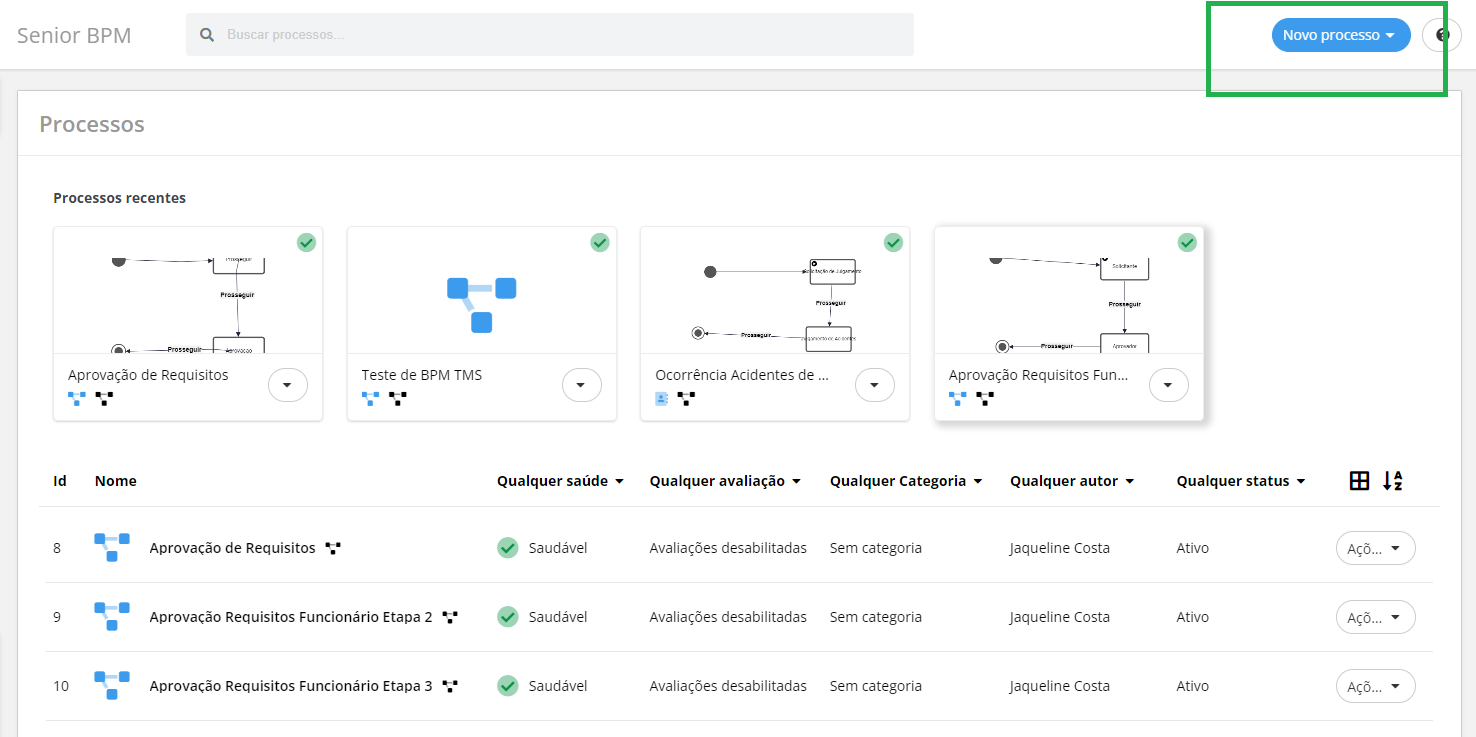 Acesse a opção Senior X Platform > BPM > Processos, e clique em Novo Processo: