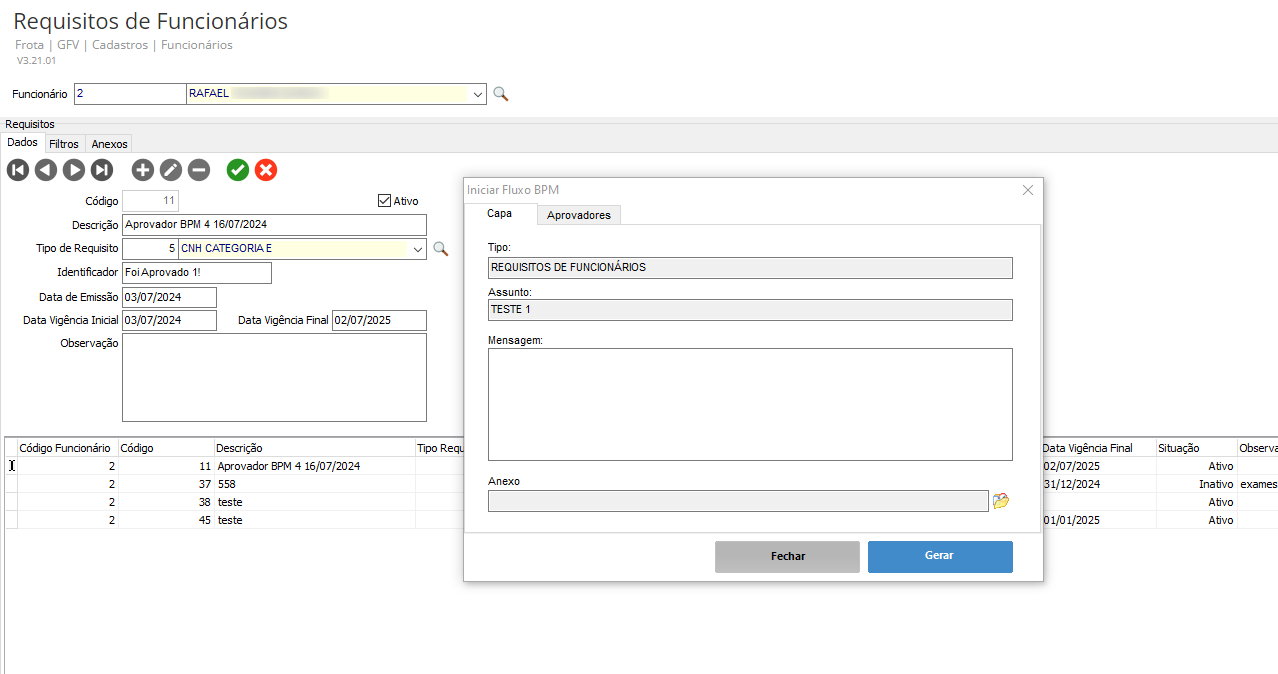 No caso do Requisitos de Funcionários, o sistema permitirá adicionar um anexo extra para ser enviado à plataforma Senior X no momento de geração do BPM.