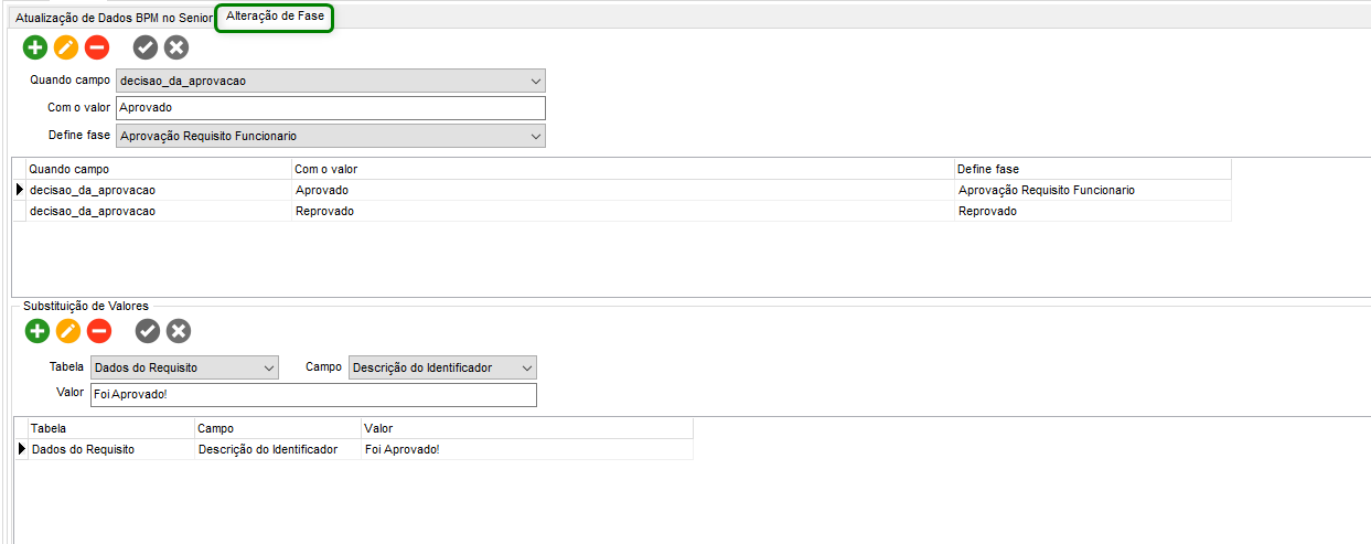 A subguia Alteração de Fase permite configurar as mudanças de status do BPM dentro do GFV. Para tal, o usuário deve escolher o campo e o valor que serão importados da plataforma, e definir o novo status (fase) do BPM. Adicionalmente, a funcionalidade de substituição de valores está disponível, possibilitando que o usuário selecione a tabela, campo e valor a ser atualizado no registro correspondente.