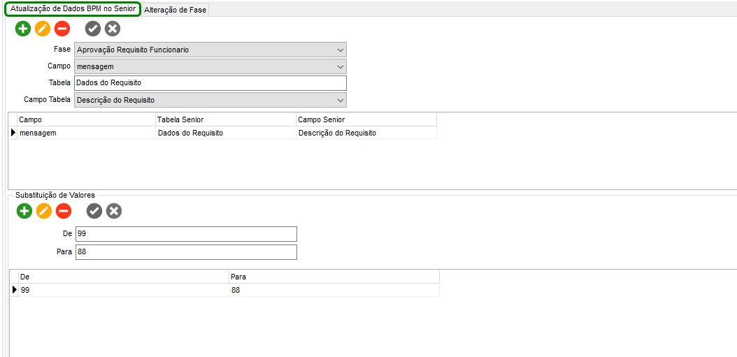 Na subguia Retorno, o usuário poderá configurar substituições de dados sempre que obter o retorno de um BPM, e na subguia Atualização de Dados BPM no Senior, o usuário poderá selecionar um campo do BPM, obter os dados imputados pelo usuário e enviar diretamente para um campo selecionado (os campos são pré-definidos de acordo o tipo de fluxo BPM). Neste caso, ainda é permitido ao usuário definir um valor especifico de entrada e o valor de substituição no campo da tabela.