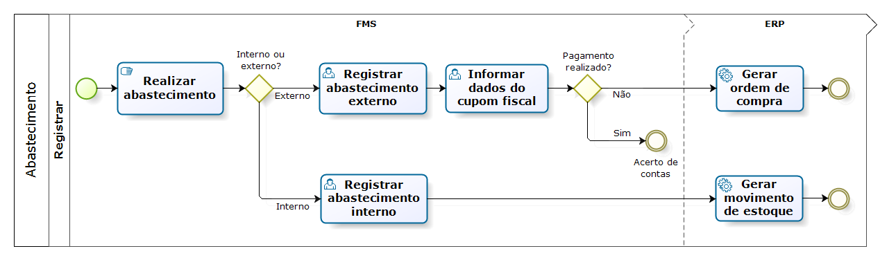 - Internamente, onde há apenas a comunicação entre o Gestão de Frotas e o suprimentos para baixa dos combustíveis abastecidos do estoque.