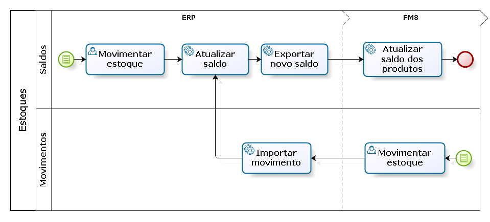 Na integração de saldos, sempre que há uma atualização de saldos no ERP, esse saldo será exportado para o FMS. Isto acontecerá por meio da porta Exportar, do web service com.senior.g5.co.mcm.est.saldoestoque.