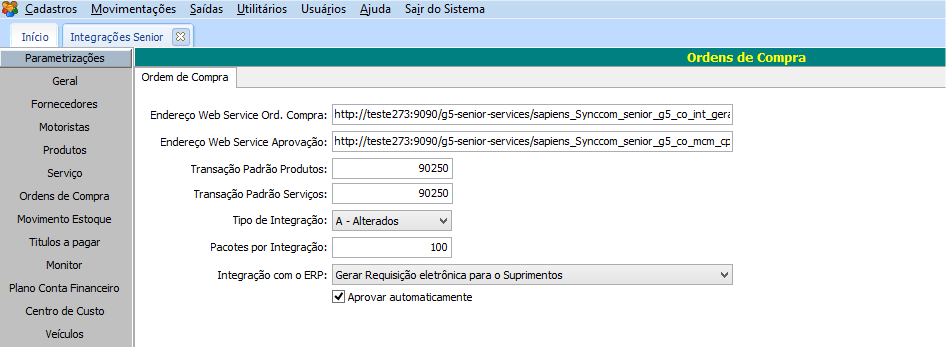 No módulo CFG em Utilitários > Configurações > Integração Senior > Parametrização > Ordem de Compra, configure o campo Integração com o ERP para Gerar Requisição eletrônica para o Suprimentos, afim de que possibilite gerar as requisição eletrônica para o ERP. Se marcado a opção Aprovar automaticamente o sistema já envia a Ordem de compra Aprovada, se não essa ordem de compra precisará ser aprovado no ERP (Gestão Empresarial | ERP).