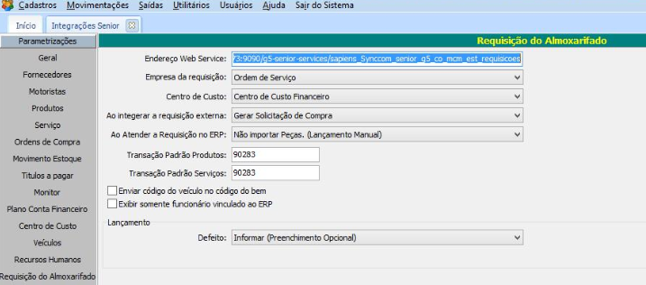 - Endereço Web Service: Deverá ser informado o web service de integração das requisições eletrônicas do suprimento para o ERP Senior.