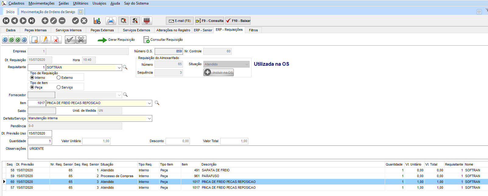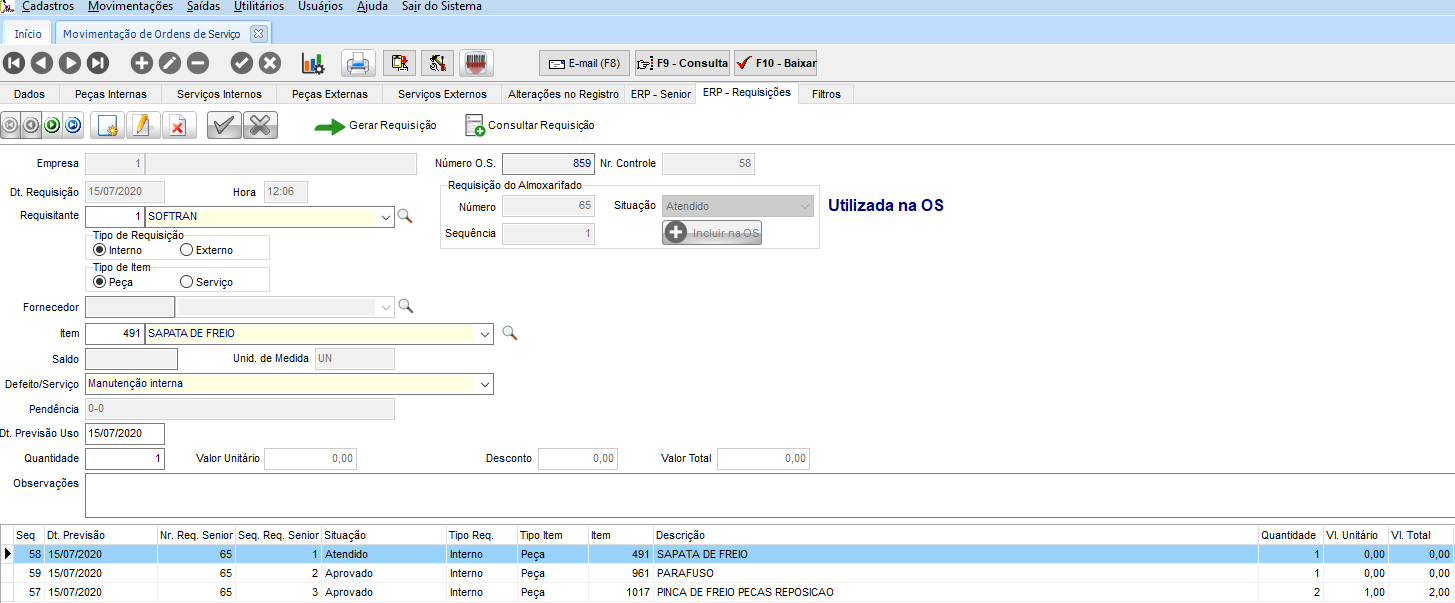 Para realizar o lançamento das peças/serviços internos e externas, que serão utilizados na ordem de serviço, devem ser lançados na guia ERP -Requisões.