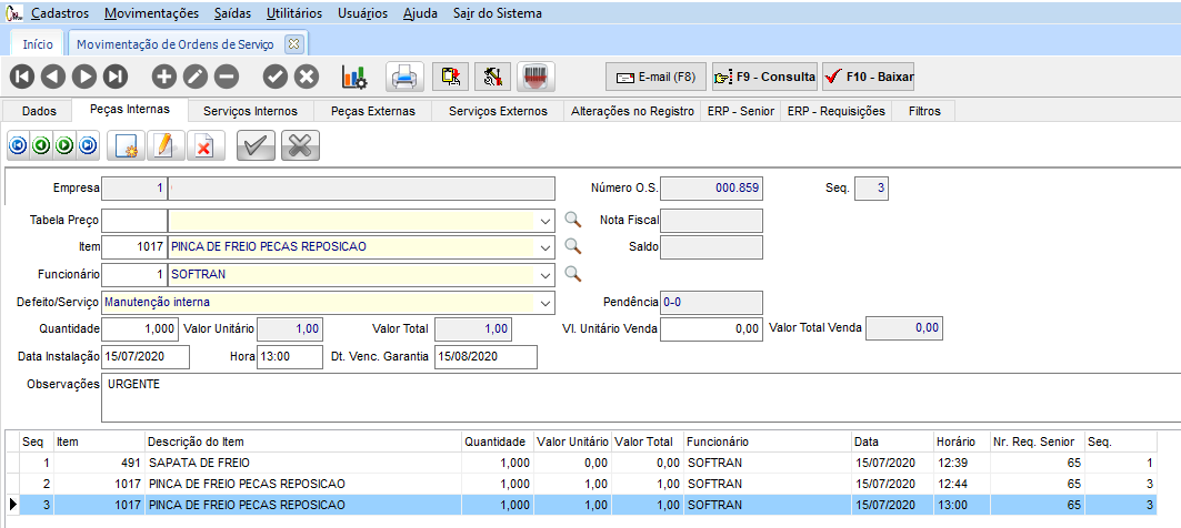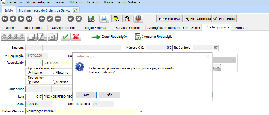 Durante o lançamento, caso já exista uma outra OS não baixada, que contenha a mesma peça informada e possua vinculação com uma requisição do ERP Senior, será exibida uma mensagem de confirmação alertando da existência da mesma.