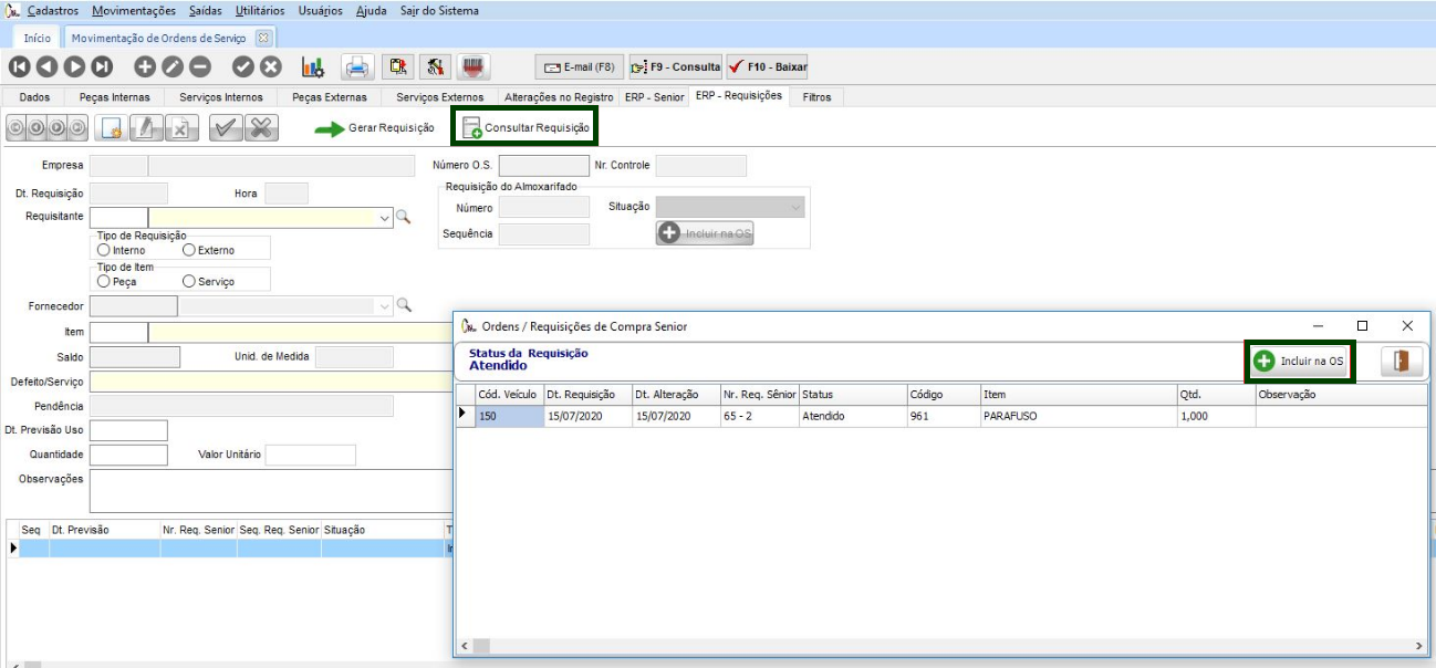 Abra uma nova ordem de serviço, na guia ERP – Requisições e clique no botão Consultar Requisição. Abrirá uma nova tela, onde serão exibidas todas as requisições vinculadas ao veículo e que não estão vinculadas a uma ordem de serviço. A inclusão da requisição na OS é feita através do botão Incluir na OS.