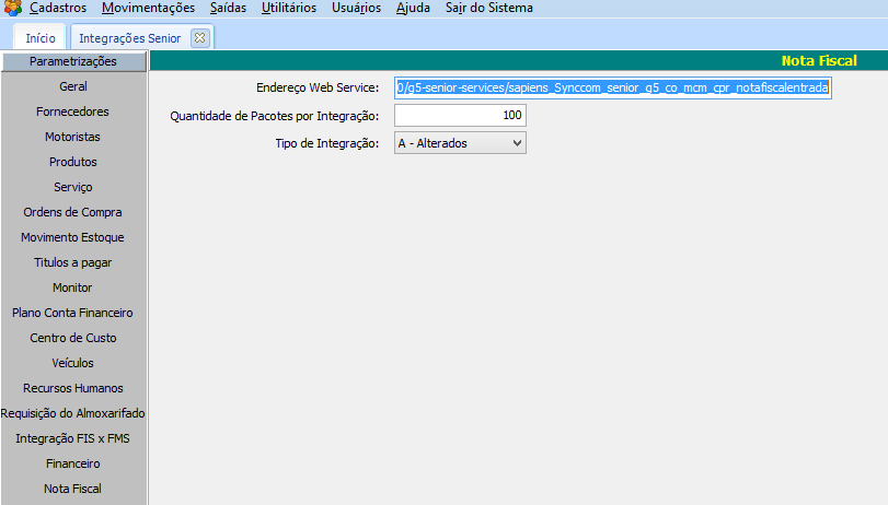 - Endereço Web Service*: Deverá ser informado o web service de integração das notas fiscais de entrada para o ERP Senior.