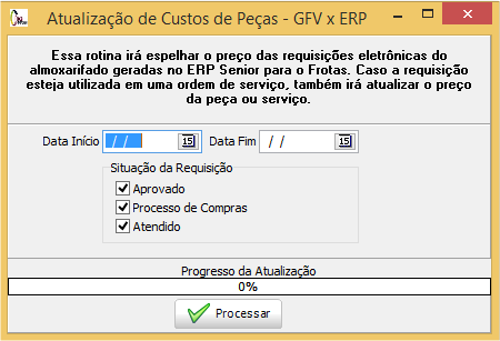 Para realizar a atualização manual do custo da peça, deverá ser definido o período da emissão das Requisições e a Situação atual da Requisição que poderá ser:
