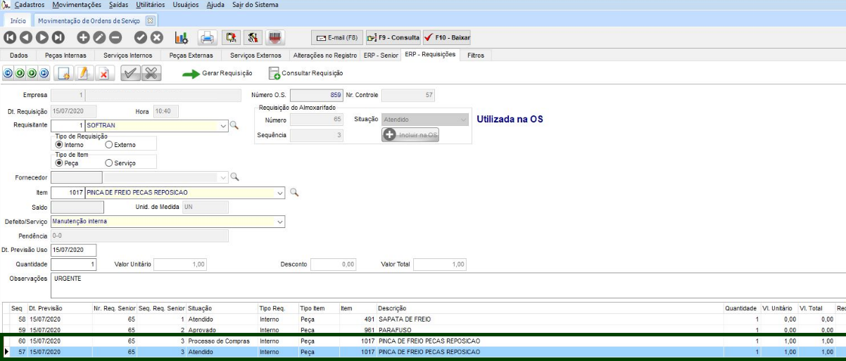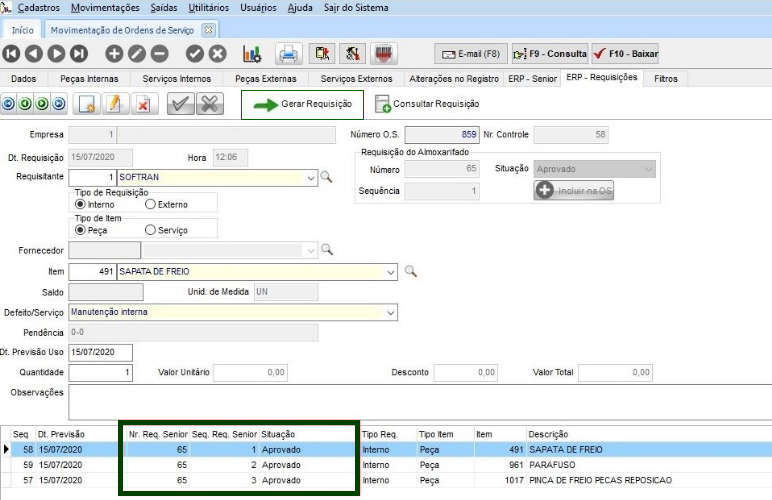 Após efetuar o lançamento das peças/serviços, é necessário clicar no botão Gerar Requisição, afim de que sejam enviadas e geradas as requisições eletrônicas no ERP Senior.