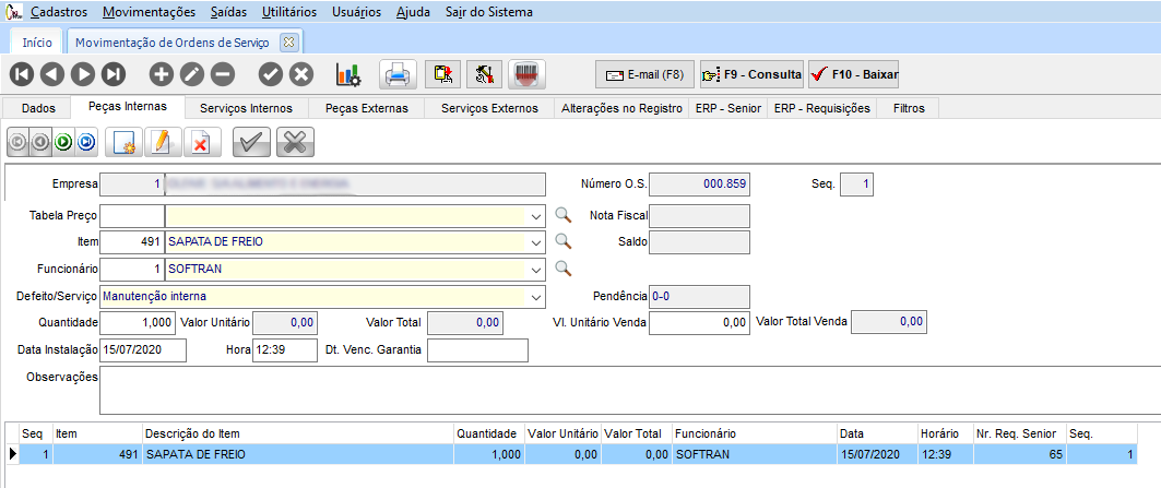 Caso seja utilizada a configuração para importar automaticamente os dados da requisição para peças internas, fim de que importe os dados das peças da requisição do almoxarifado do ERP para a guia peças internas da Ordem de serviço do FMS. Será atualizada a situação da requisição e também atualizada o preço da peça com o valor retornado pelo ERP.