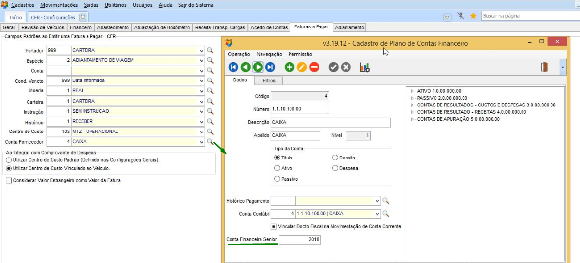 No CFG no menu Utilitários > Configurações > Frota > CFR - Custo da Frota, na guia Faturas a Pagar, no campo Fornecedor clique na lupa e informe o campo Conta financeira Senior, esta conta deve ser o mesmo número cadastrado no ERP Senior.