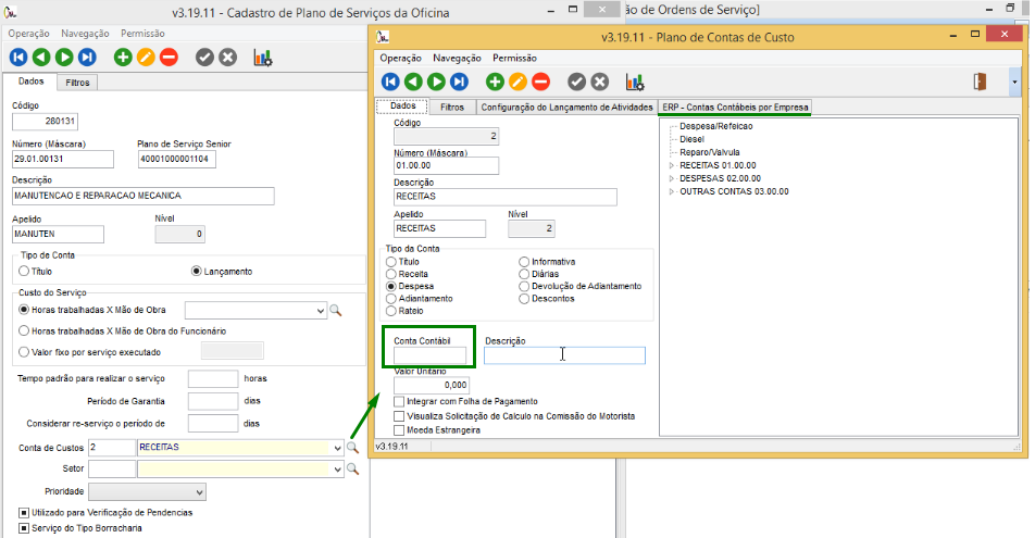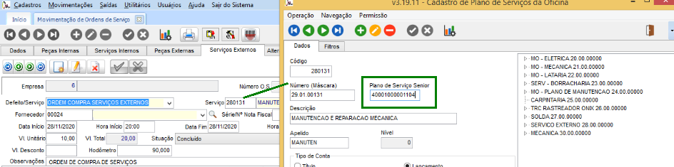- clique na lupa do campo Serviço e preencha o campo Plano de Serviço Senior com o mesmo código do ERP Senior.