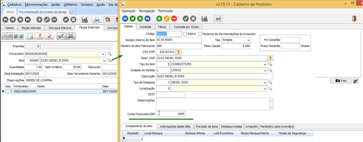 Caso seja utilizada as configuração para importar automaticamente os dados da requisição para peças internas, fim de que importe os dados das peças da requisição do almoxarifado do ERP para a guia peças internas da Ordem de serviço do FMS.