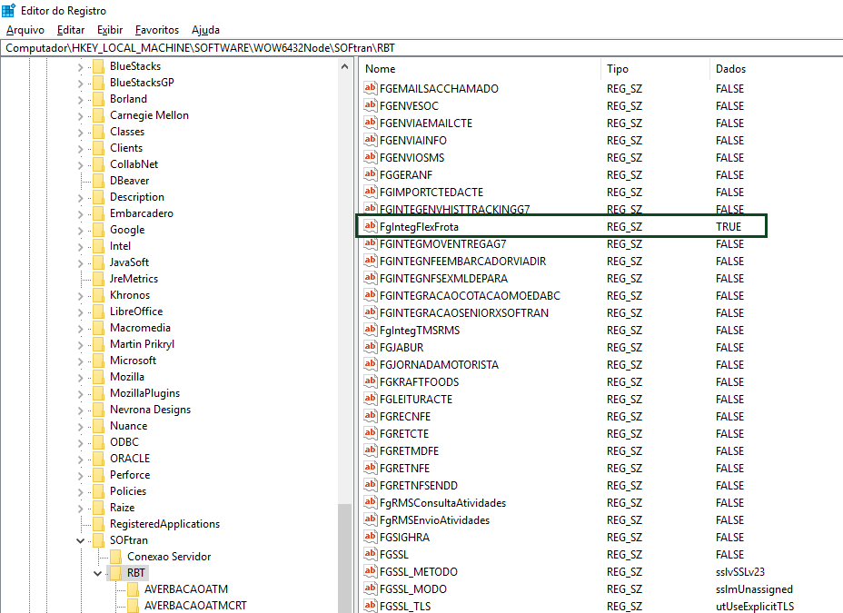 - Após a configuração do serviço RBT, a opção FgIntegFlexFrota deve estar marcada no REGEDIT como TRUE.