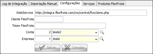 Na guia Configurações, deverá ser informado os dados para a conexão com o Web services: endereço Web services, código do Cliente FlexFrota e Token que são disponibilizados pela FlexFrota (conforme pré requisitos). Os campos Conta e Empresa, devem ser informadas para que seja realizado o lançamento de atividade da integração.
