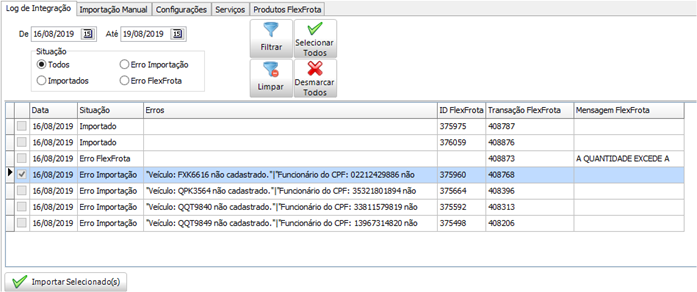 Ao realizar a importação manualmente ou automática dos registros integrados do FlexFrota, será possível acompanhar a importação através da aba “Log de Integração”, onde será apresentado os registros importados e que ocorreram falha, com possibilidade de reimportar novamente o registro.