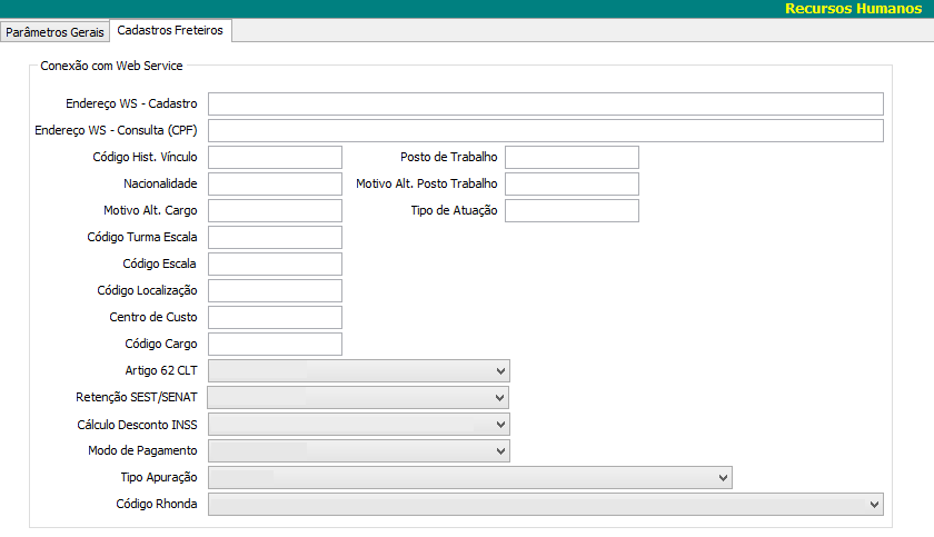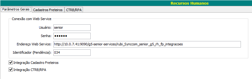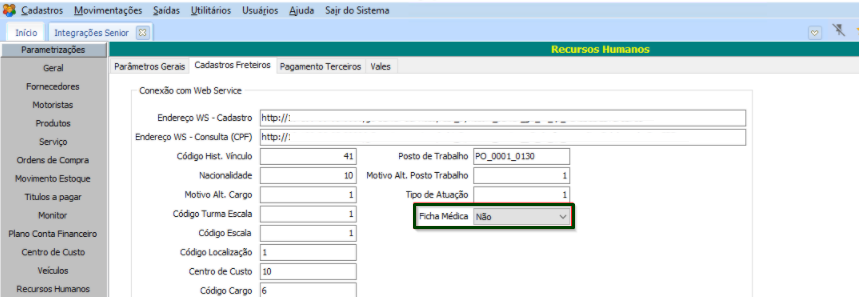 Marcar a opção Integração Cadastro Freteiros, após realizar essa ação, a guia Cadastros Freteiros será apresentada para configurar a conexão com o web service. Os dados para a conexão com o web service devem ser informados para que a integração do freteiro cadastrado no Senior Logística ocorra corretamente com o cadastro de terceiro do HCM.