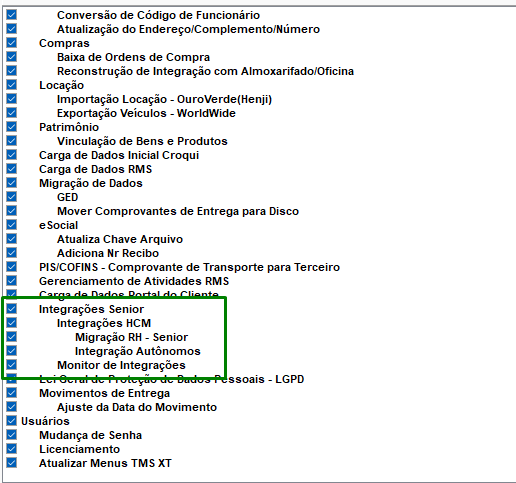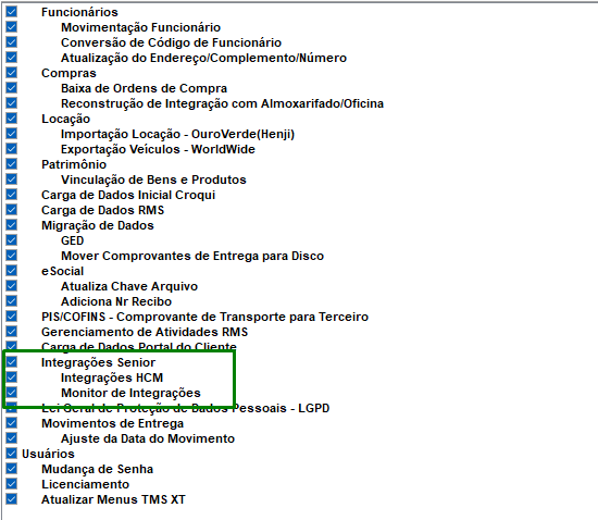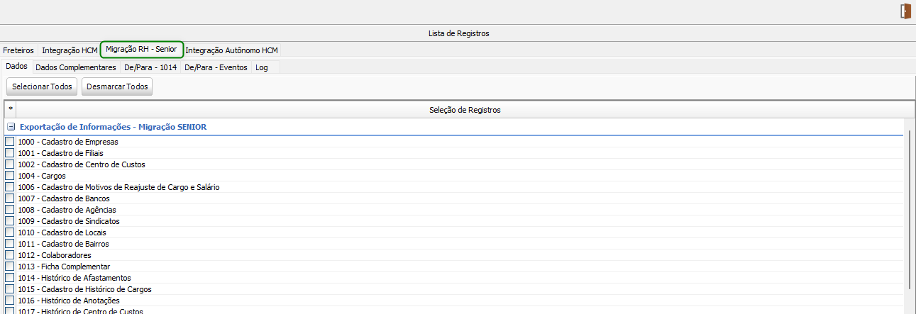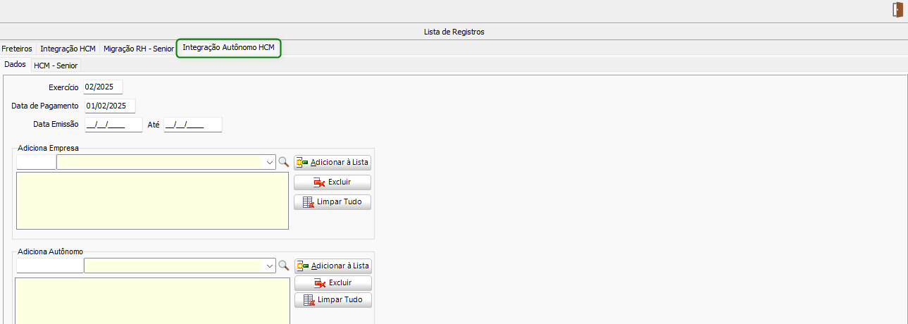 E exibindo as guias Integração HCM, Migração RH - Senior e Integração Autônomo HCM separadamente dentro da rotina: