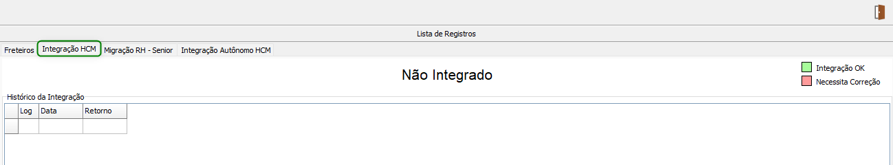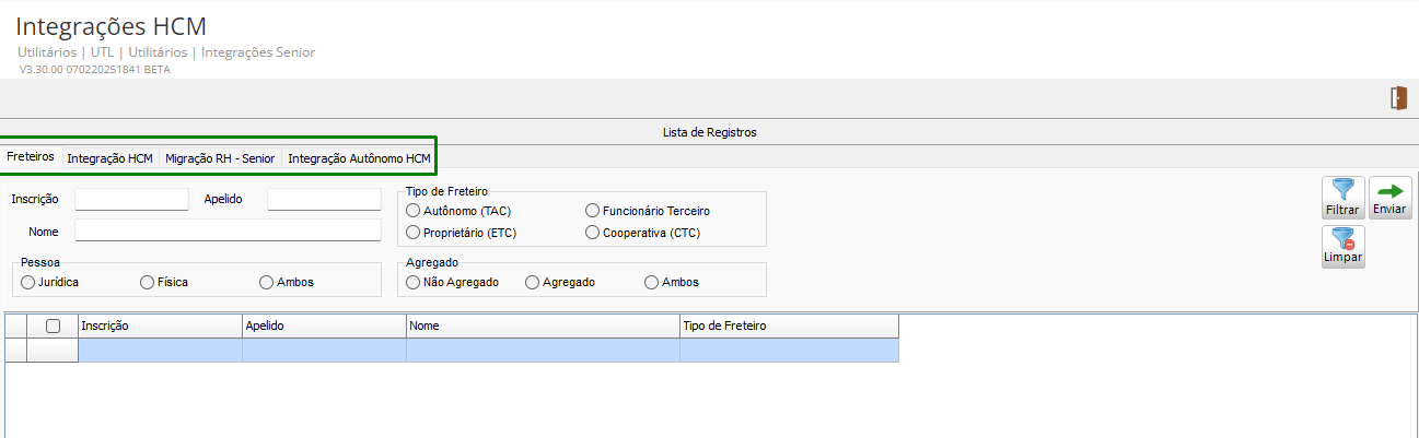 No módulo UTL, em Utilitários > Integrações Senior > Integrações HCM > Integração HCM, na guia Freteiros, será exibido os seguintes campos: