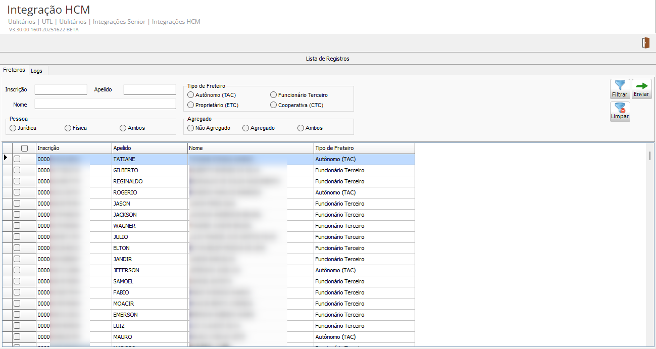 Nesta tela de Integração HCM, você verá a lista de Freteiros cadastrados. Ao selecionar os registros conforme os filtros, é possível enviar os dados em massa para o HCM. Se houver divergências, elas serão registradas na guia Log.