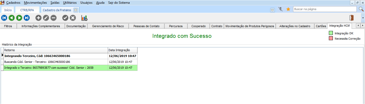 Caso a integração seja realizada com sucesso, será apresentado o código do freteiro criado no Gestão de Pessoas | HCM. E se a integração falhar será exibida a instrução de qual campo precisa ser preenchido no cadastro de freteiro do Senior Logística | FMS, após o ajuste do cadastro, basta enviar novamente a integração.