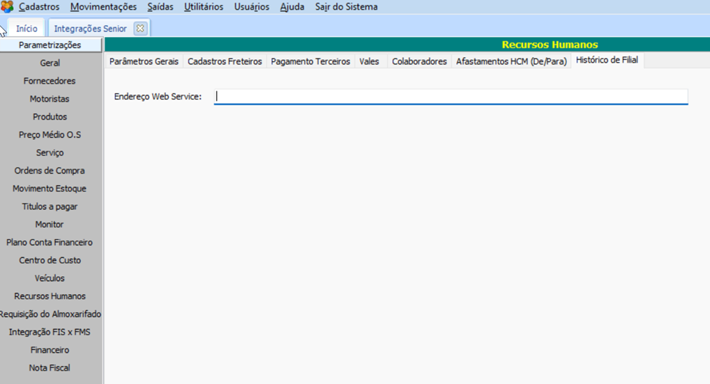 No módulo CFG | FMS, no menu Utilitários > Configurações > Integrações Senior > Recursos Humanos, na guia Histórico de Filial, configure a conexão com o webservice para que a integração do Histórico da Filial do Freteiro alterado no Senior Logística ocorra corretamente com o histórico de filial do HCM.