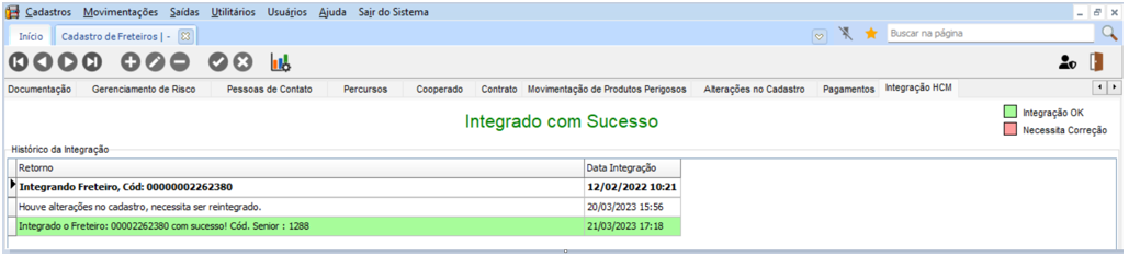 Após realizar a configurações, no módulo de FTR – Freteiros | FMS, em Cadastros > Motoristas > Freteiros, temos a guia Integração HCM, que ao alterar a filial do freteiro e salvar a alteração, automaticamente será integrado o registro com o Histórico de Filiais no Gestão de Pessoas | HCM, apresentando um status de sucesso ou fracasso da integração.