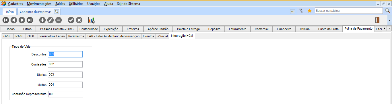 Ainda no módulo CFG em Cadastros > Empresas > Folha de Pagamento, na guia Integração HCM informe o tipo de vale (cadastrado no Gestão de Pessoas | HCM) para o campo Multas.