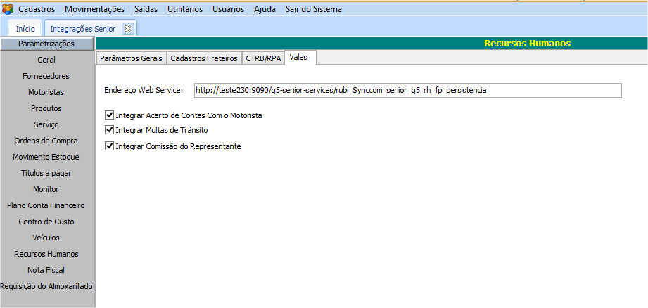 No módulo CFG em Utilitários>Configurações>Integrações Senior, a guia Recursos Humanos > Vales, deverá ser informado o endereço do web service disponibilizado pela Senior e habilitar a integração com multas de trânsito.