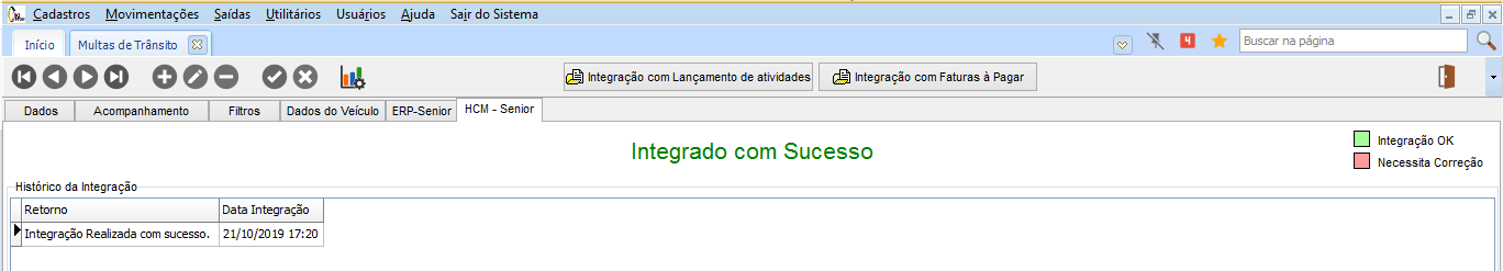 Se a integração ocorrer corretamente ou se houver falha, será apresentado na guia HCM - Senior a situação da integração.