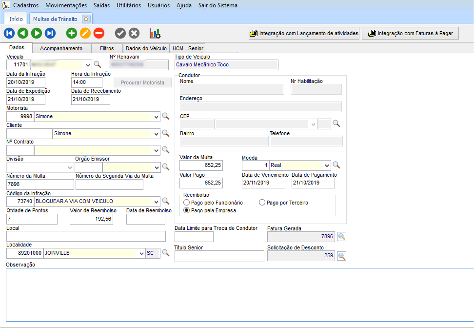 No módulo GFV – Gestão de Frota| FMS, em Movimentações > Multa de Trânsito ao salvar a multa cadastrada com reembolso pago pelo funcionário será integrada com o Gestão de Pessoas | HCM o valor da multa gerada no Senior Logística.