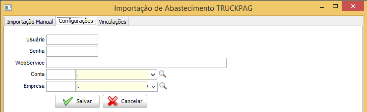 - Na guia Configurações, deverá ser informado os dados para a conexão com o Web services: endereço Web services, usuário e senha que são disponibilizados pela TruckPag (conforme pré requisitos). Os campos Conta e Empresa, devem ser informadas para que seja realizado o lançamento de atividade da integração.