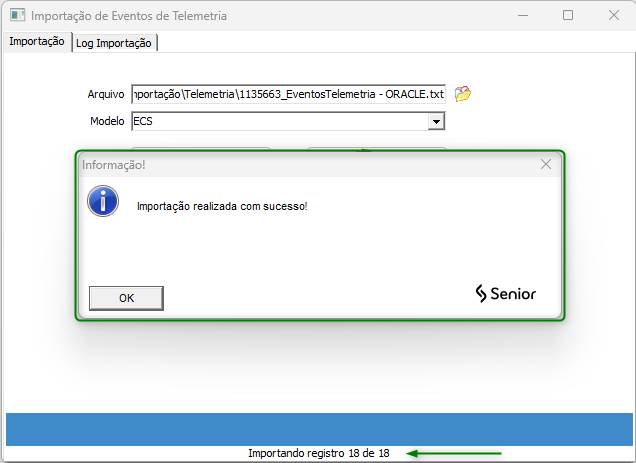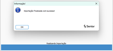 - Se a importação for bem-sucedida, serão apresentadas a quantidade de registros importados e a seguinte mensagem: