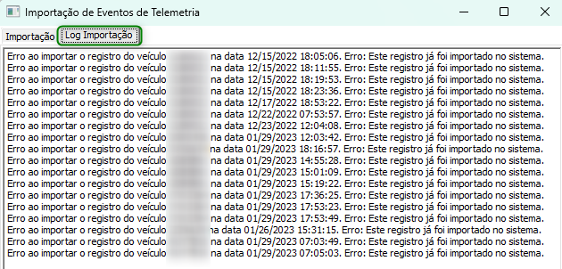 - Ainda na mesma tela, na guia Log Importação, será exibido o log detalhando a importação do arquivo de telemetria, auxiliando na verificação em casos de erros de importação: