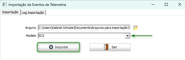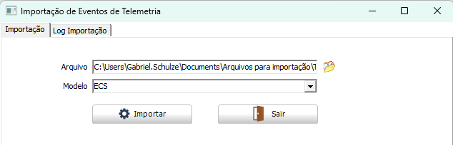 - Na guia Importação, clique no campo Arquivo e selecione o arquivo de eventos de telemetria desejado, utilizando o botão de pesquisa