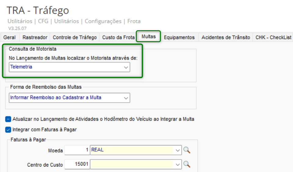 Na sequência, ir para o módulo CFG e acessar Utilitários > Configurações > Frota > TRA - Tráfego. Clicar na guia Multas e em No Lançamento de Multas localizar o Motorista através de: escolher a opção Telemetria: