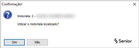 Na sequência o sistema irá realizar uma busca, e caso encontre algum motorista que corresponda à pesquisa, retornará questionando se deseja utilizar este motorista: