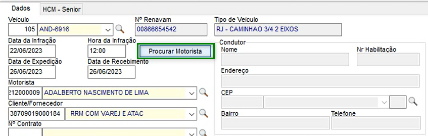 Esta rotina permite associar o motorista ao veículo no momento da infração por meio da telemetria. Clicando no botão Procurar Motorista, o sistema automaticamente correlaciona os dados da telemetria com os registros de funcionários. Se um motorista correspondente for encontrado, o usuário tem a opção de associá-lo à multa.