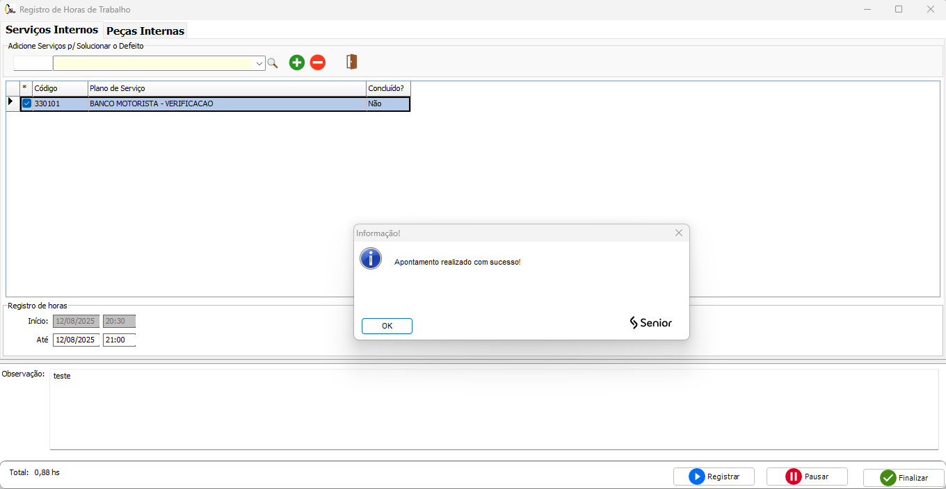 Botão Registrar: Insere os apontamentos de horas realizadas para o serviço.