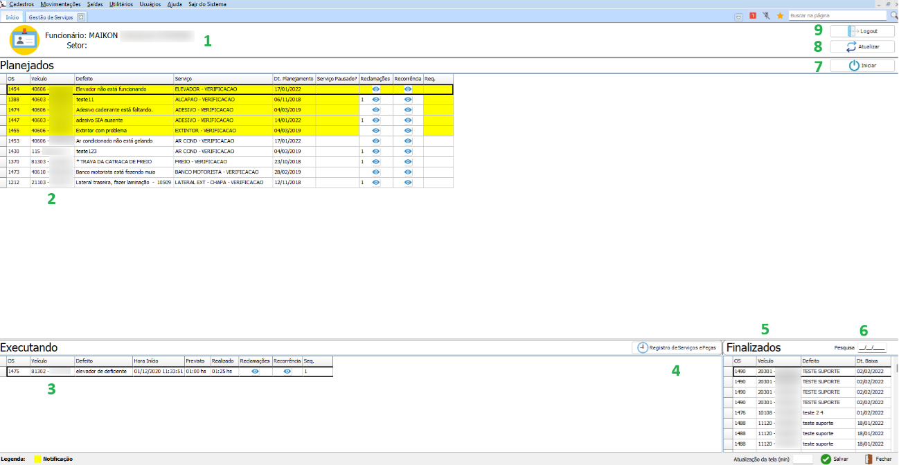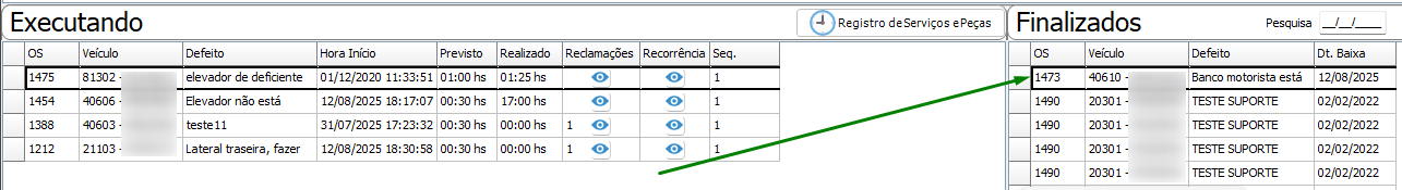 - Após inserir o crachá e pressionar Enter, a O.S. será movida para o grid Executando.