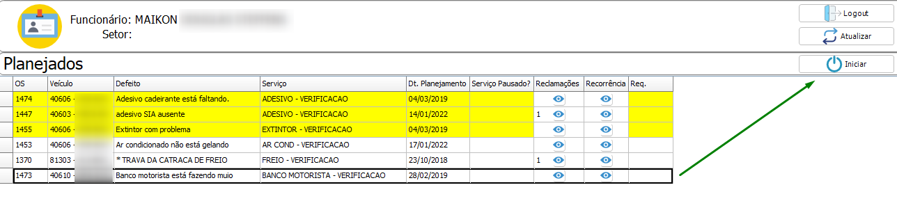 - Com a O.S. selecionada, clique no botão Iniciar.