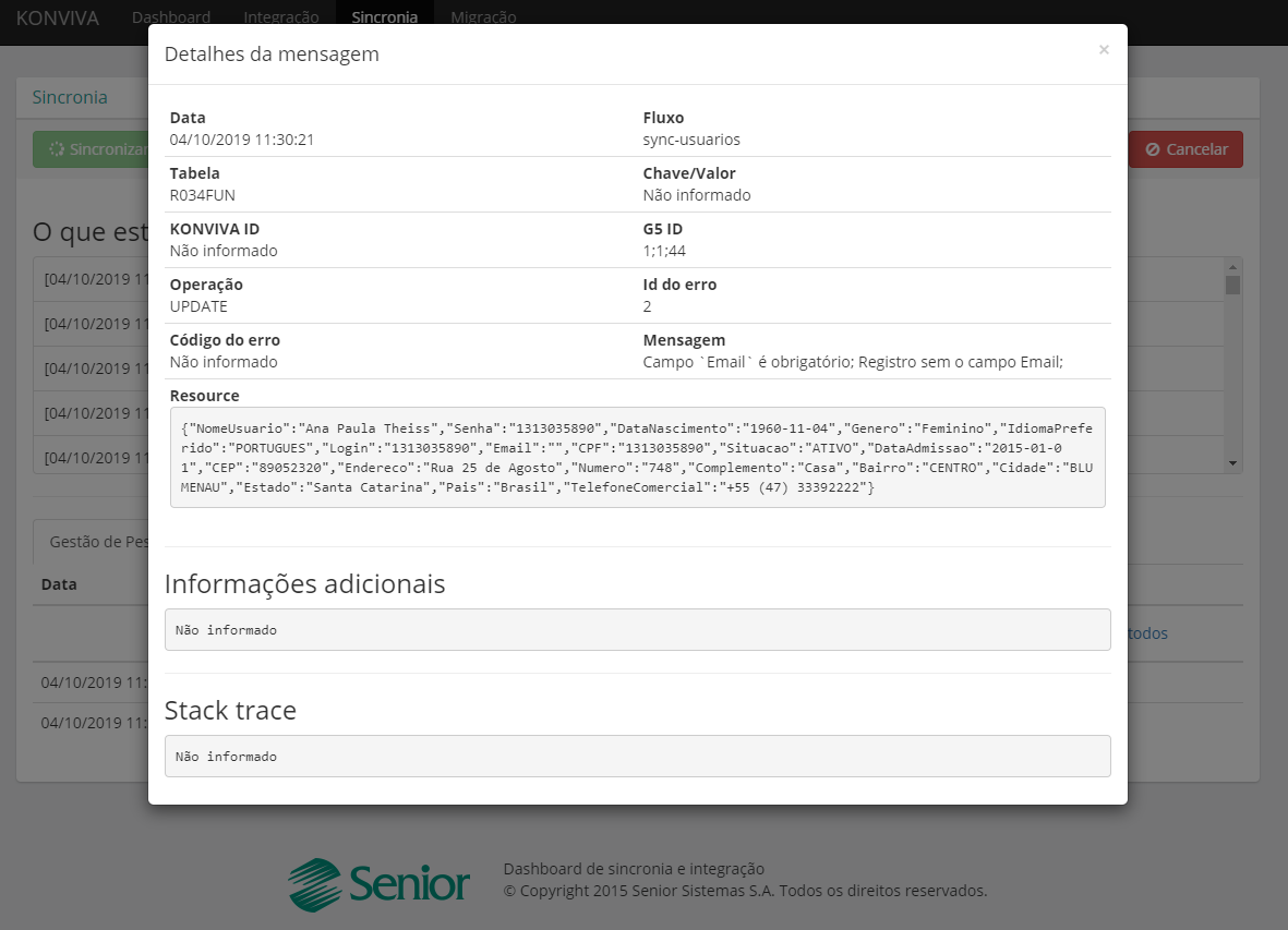 | Se foi encontrado outro registro para o mesmo assunto com o identificador da Senior repetido. | Alerta | Já foi processado um registro com este identificador da Senior. |