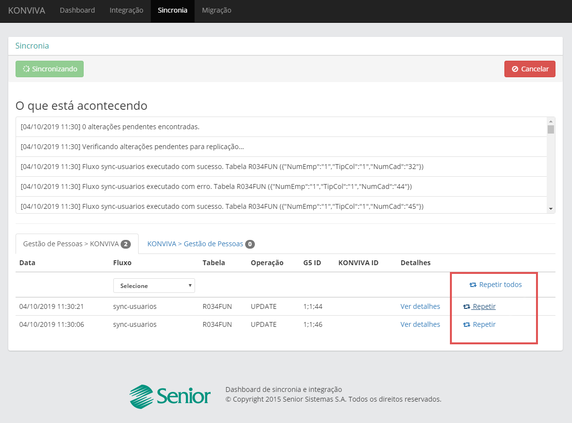 - Sincronia: processo que envia constantemente as atualizações entre os sistemas. Esse processo precisa ser habilitado e deve ficar em execução de forma contínua após o processo de carga dos fluxos.