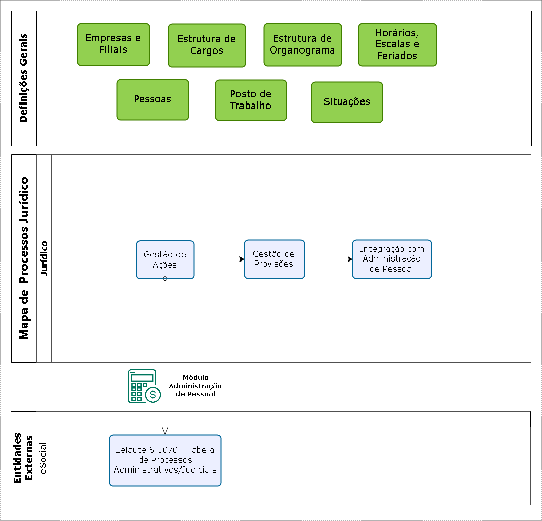 O Jurídico é composto por diversos processos, por sua vez divididos em subprocessos e tarefas a serem executadas. Também possui definições gerais de cadastros e parametrizações, das quais algumas são voltadas especificamente para o módulo, enquanto outras têm impacto em todo o Gestão de Pessoas | HCM, regendo todas as operações do sistema.