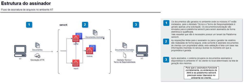 Para que seja possível realizar a assinatura dos documentos, é necessário liberar o endereço da plataforma seniorX (platform.senior.com.br) e AWS (hcm-signer-doc.s3.sa-east-1.amazonaws.com) na infraestrutura onde o sistema XT está instalado (Firewall, por exemplo).