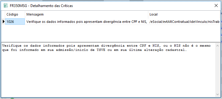 A mensagem de erro aparecerá na tela de detalhamento das críticas (FR350MSG).